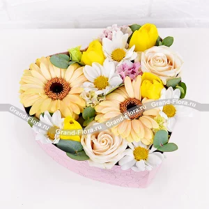 Солнечные дни - коробка с желтыми тюльпанами и герберами