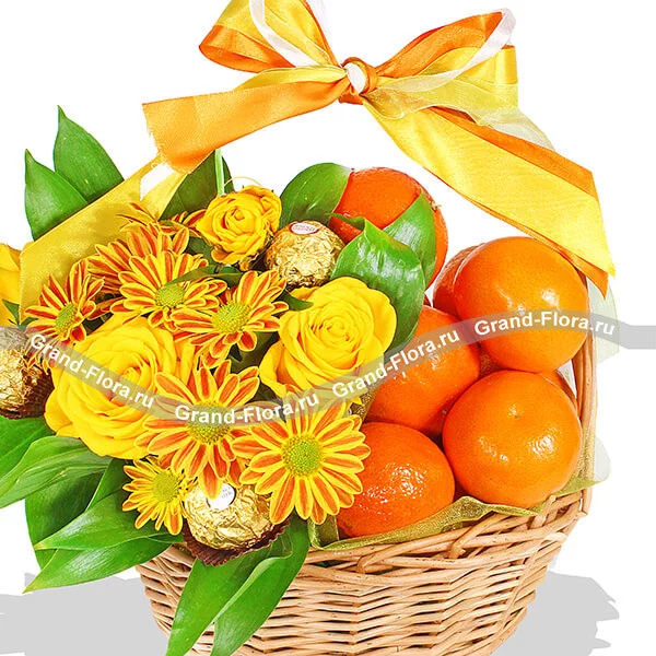 Стандартный: мандарины - 1 кг., конфеты "Ferrero Rocher" - 1 шт., хризантема оранжевая - 2 шт., роза кустовая желтая - 2 шт., декоративная зелень, оазис, корзина средняя, желтый фетр, желто-оранжевый бант.