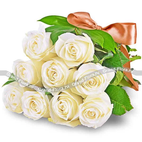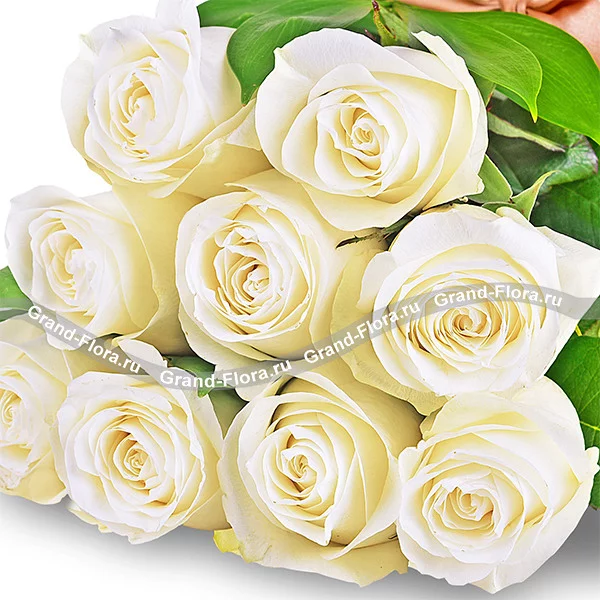 Букет белых роз  (акционный букет, высота роз 40-50 см). Роза белая 40-50 см - 9 шт, упаковка, лента